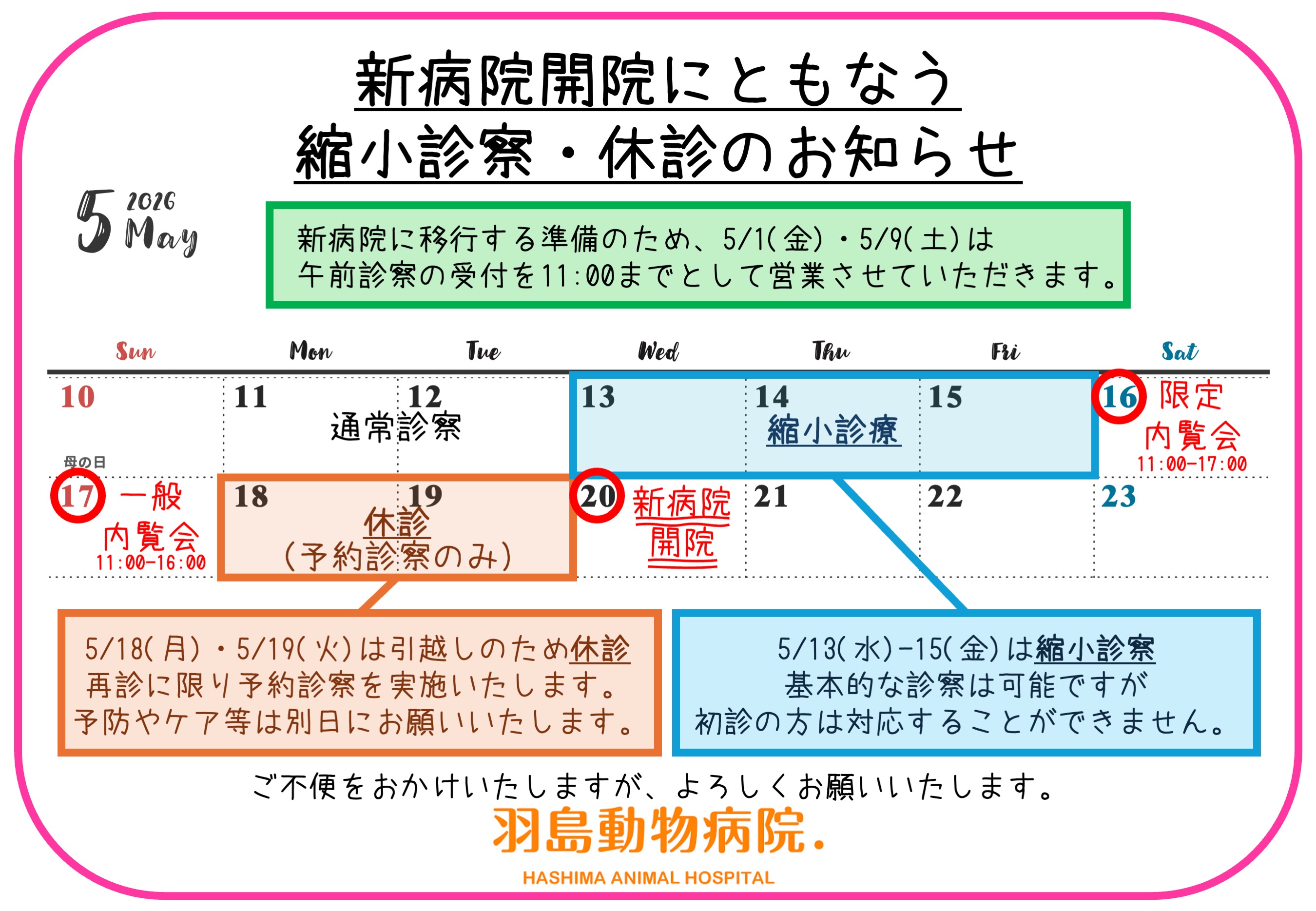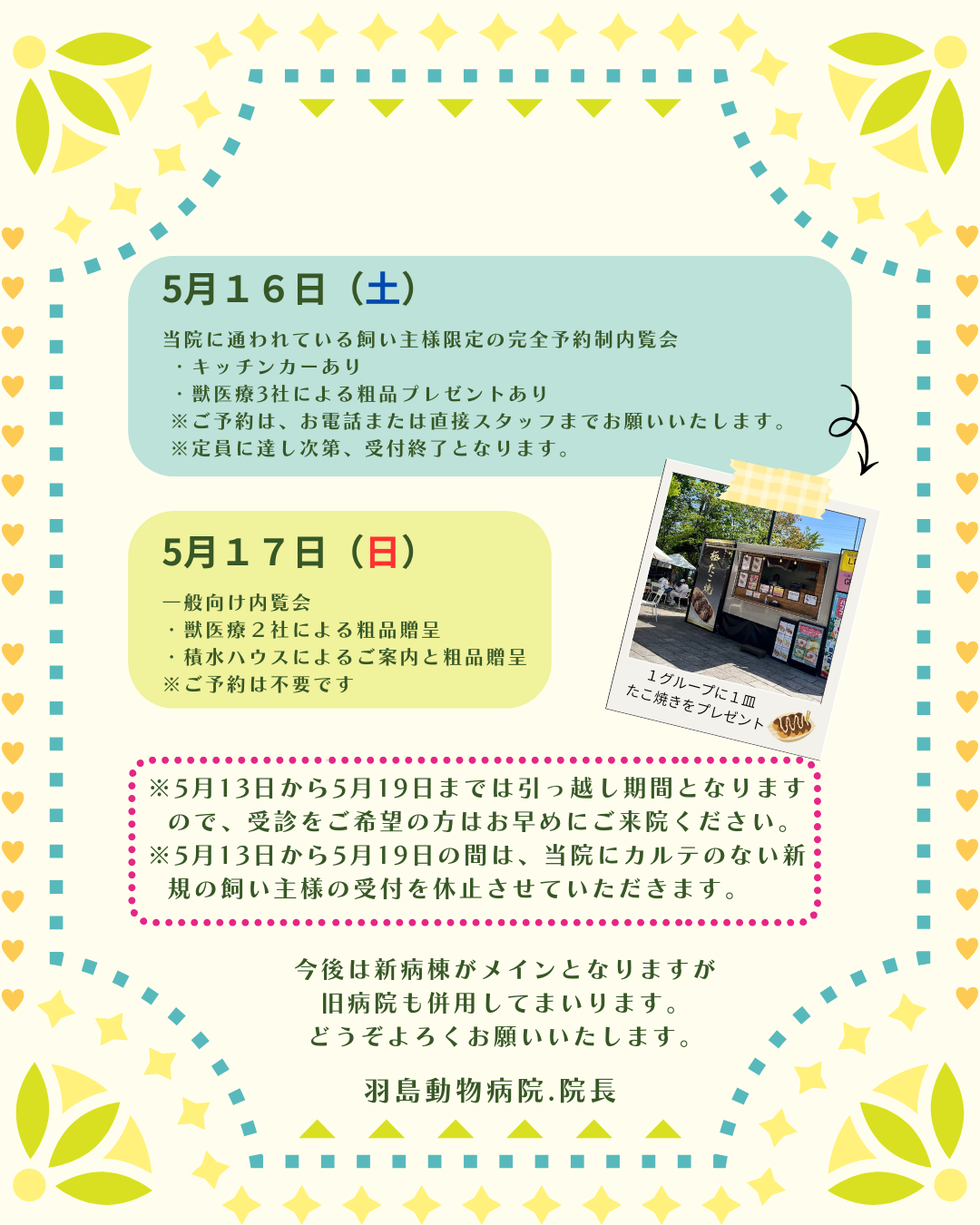 5月16日は当院に通われている飼い主様限定の完全予約制内覧会(要予約)、