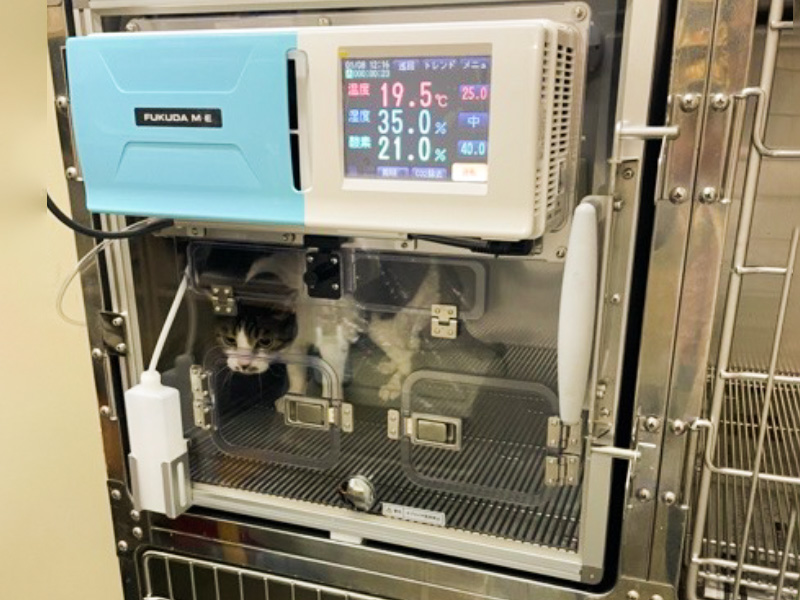 十分覚醒するまで獣医師および看護師で観察します。時折、体温を測定して、体温が低ければ保温します。呼吸状態によっては酸素室を利用します。